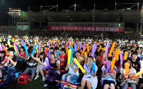 金秋九月,惠风和畅,荔园添新,欢聚一堂。9月14日晚,vsport田径场灯光闪耀,掌声雷动,我校2011年开学典礼暨迎新晚会在这里隆重举行。伴着激扬的旋律,第二十六届世界大学生夏季运动会开幕式“深大元素”再次精彩亮相,标兵、旗手、执旗手立于场内两侧挥舞双臂,尽情鼓掌。90名开幕式“鲜花少女”在舞台上踏着灯光,舞动 《鲜花礼赞》,讴歌生命,赞美青春,引起了新生们的阵阵喝彩。校领导江潭瑜、章必功、陶一桃、阮双琛、邢锋、李永华,中国工程院院士牛憨笨、中国科学院院士倪嘉缵,各学院、各机关单位、教研教辅单位的负责人,学生家长代表及2011级全体新生出席典礼。