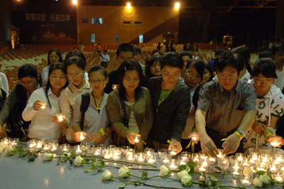 我校为汶川地震遇难同胞举行追思会 5月20日晚,为了表达对四川汶川大地震遇难同胞的沉痛哀悼,我校在演会中心举行追思会,为逝者祈祷,为生者祝福;并现场开展继续向灾区人民捐款活动。校领导江潭瑜、章必功、陶士平、陶一桃、阮双琛、陈思平、李永华,各部处、各学院负责人以及各学院、留学生部学生代表近2000人参加了追思会。 ...