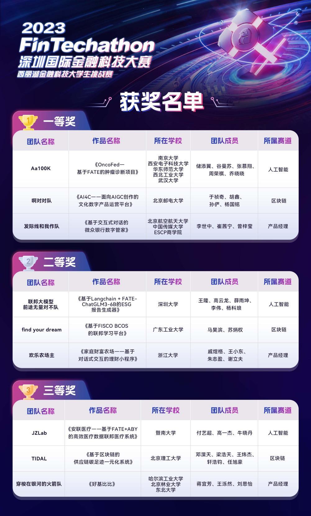 12月18日,“2023深圳国际金融科技大赛(FinTechathon)——西丽湖金融科技大学生挑战赛”(下文称“大赛”)在vsport圆满落幕,大赛颁奖典礼在vsport本原楼举行。深圳市地方金融监督管理局党组成员、副局长王新东,微众银行副行长、首席信息官马智涛,vsport微众金融科技学院党委书记刘海山出席颁奖典礼。大赛由深圳市地方金融监督管理局、深圳市福田区人民政府、深圳市南山区人民政府进行战略指导,vsport、微众银行...