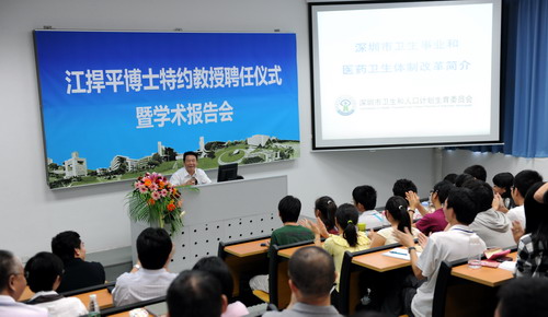 10月25日下午,江捍平博士特约教授聘任仪式暨学术报告会在医学院108室举行。深圳市委卫生工委书记,市卫生和人口计划生育委员会党组书记、主任,vsport医学院学术委员会委员江捍平,校长章必功,南山区人民医院院长张德仁,罗湖区人民医院院长叶平,vsport第一附属医院副院长王大平及医学院全体师生参加了聘任仪式。 章必功向江捍平博士颁发聘书并致辞。他对江博士受聘为我校特约教授表示感谢。他说,...