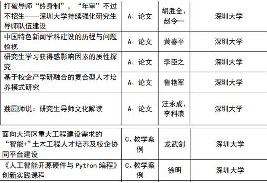 接《关于2021年广东省学位与研究生教育学会优秀教育成果奖的通知》,经专家评审、面向社会公示和评奖委员会审核通过,2021年度我校共有7项成果获广东省学位与研究生教育学会优秀教育成果奖,获奖数量与中山大学并列全省第1位。获奖名单详情如下: