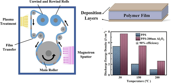 图1. 卷对卷磁控溅射工艺制备的PPS/Al2O3高温电容膜示意图及其性能表征。