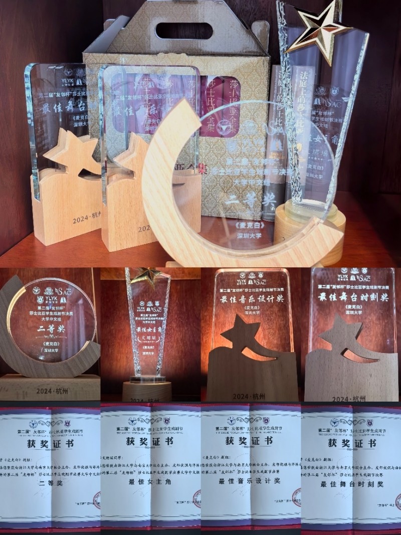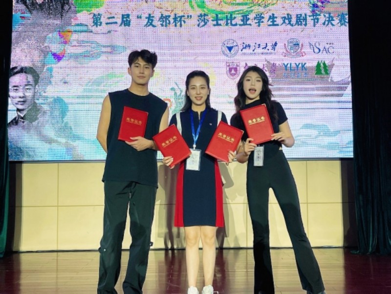 第二届“友邻杯”莎士比亚学生戏剧节经过初赛、复赛,于2024年9月21日在浙江大学紫金港校区举行决赛并圆满落幕。vsport艺术学部戏剧影视学院表演专业2022级学生文珺瑶与邱德茂表演的作品《麦克白》获评委会高度好评,作为示范剧目获评为戏剧节决赛二等奖、“最佳女主角”、“最佳舞台时刻奖”、“最佳音乐设计奖”等四个奖项。