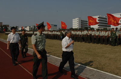 军训二团2000多名大一新生在广州武警指挥学院进行军训。校领导检阅九个连的学员。学员们精神抖擞,军姿威武,用响亮的回答来迎接检阅。