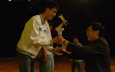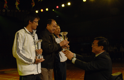 裁判长宣读了本次运动会比赛成绩。校领导章必功、阮双琛、陈思平分别为综合运动会获奖团体、学生田径获奖团体和教工田径获奖团体颁发奖杯。