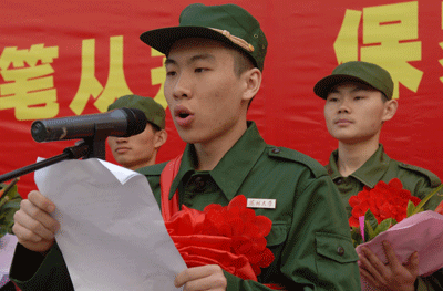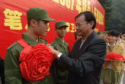 携笔从戎,保家卫国;脚踏实地,自强不息。12月13日,我校2007年新兵入伍欢送仪式在演会中心广场隆重举行。党委书记江潭瑜亲自为入伍学生佩戴大红花和校徽。前来参加欢送仪式的有各学院老师、同学及部分学生家长和亲友。