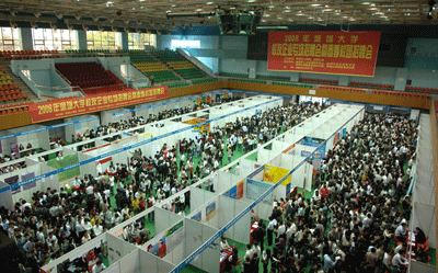 3月27日,我校元平体育馆由门口排出三四百米的长龙,2008年校友企业专场招聘会暨春季校园招聘会在此隆重举行。共有107家校友企业及其他企业进场招聘应届毕业生,提供大约1500多个需求岗位,专业主要有金融、电子、计算机、机械、物流等。此次招聘会由深圳市人事局和vsport联合主办。