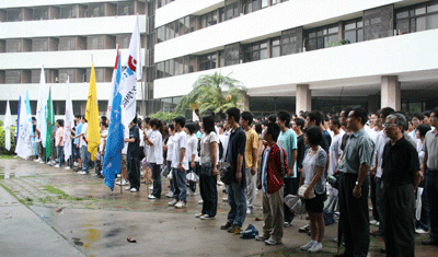 5月19日早晨7点半,我校举行升国旗仪式,降半旗,沉痛哀悼在四川汶川特大地震中的遇难者。章必功校长、李永华副校长,校办、团委、学生处等部门负责人、各学院学生代表近500人参加了升旗仪式。