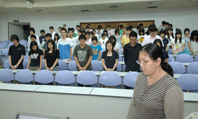 仪式中,在场师生神情肃穆,在心中默默地哀悼遇难者,祝福幸存者。