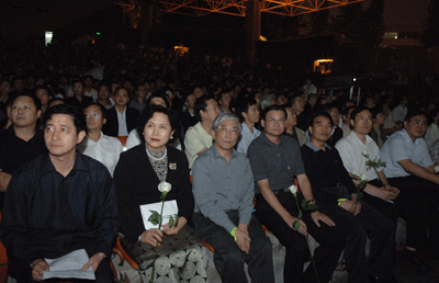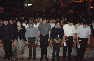 5月20日晚,为了表达对四川汶川大地震遇难同胞的沉痛哀悼,我校在演会中心举行追思会,为逝者祈祷,为生者祝福;并现场开展继续向灾区人民捐款活动。校领导江潭瑜、章必功、陶士平、陶一桃、阮双琛、陈思平、李永华,各部处、各学院负责人以及各学院、留学生部学生代表近2000人参加了追思会。