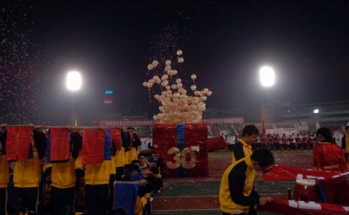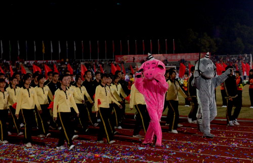 在国旗、校旗、鲜花队、红旗队的引领下,由各学院方队依次通过主席台前,呈上了精彩纷呈的表演,展示了当代大学生的青春活力。