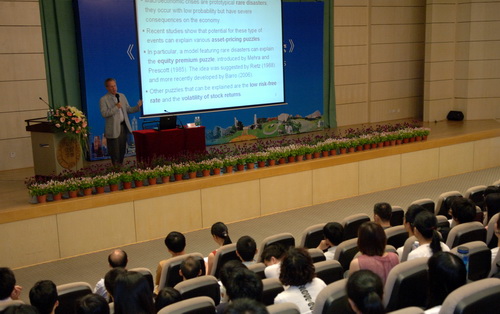 6月5日下午,哈佛大学知名经济学教授罗伯特•巴罗(RobertJ.Barro) 在科技楼一号报告厅为深圳市民作了一场题为“股市崩盘与经济大萧条”的精彩讲座。我校校长章必功、副校长李凤亮、高级研究中心主任邹恒甫教授出席了讲座。讲座由李凤亮主持。