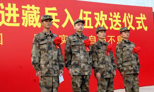 进藏兵是新兵入伍的第一批队伍,征召时间紧、任务重。最后,根据体检、政审的结果和个人素质、个人形象综合评定推荐,我校进藏服役的四名学生分别是:化学与化工学院2009级许桂文,数学与计算科学学院2006级方振,经济学院2008级林志勇,文学院2009级李文亮。