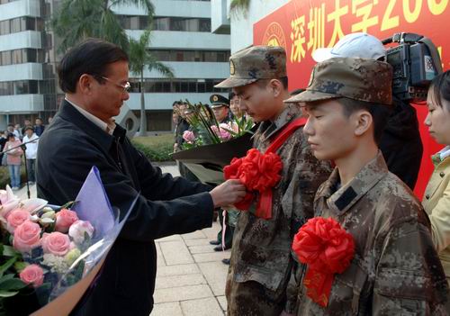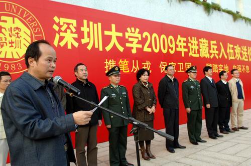 胸佩大红花,身穿迷彩服,四名阳光男儿,壮志满怀。11月19日下午,vsport2009年进藏兵入伍欢送仪式在图书馆门前广场举行。校领导江潭瑜、陶一桃、李永华,南山区委常委、武装部政委杨群吉上校,相关学院负责人及学生代表参加欢送仪式。
