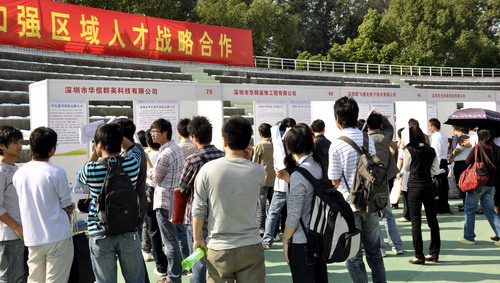 11月28日,“2009年秋季高校毕业生就业服务周暨珠三角九城市2010届高校毕业生就业招聘会”深圳市专场在我校元平体育场举行。本次招聘会有70多家企业进场,提供约近1000个就业岗位,吸引了校内外近10000名毕业生进场求职。
