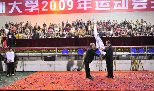 梁道行向章必功校长授大运会旗帜,章必功将旗帜授予我校大运会志愿者代表。