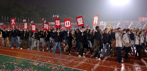 入场式的最后,由200名vsport大运会志愿者组成的方阵精彩亮相。他们身着印有大运会标志的T恤,以整齐划一的步伐,阳光、健康的精神风貌步入会场,把会场气氛推向高潮,全场爆发出阵阵热烈掌声和欢呼。