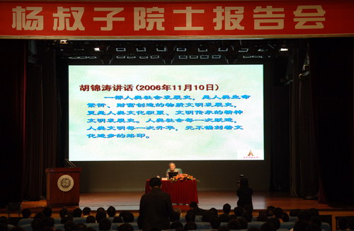 12月14日,华中科技大学杨叔子院士在国际会议厅为我校师生做了一场题为“时代发展趋势:科学人文交融”的精彩讲座。校党委书记江潭瑜在讲座前与杨叔子院士进行亲切交流。讲座由校长章必功主持。