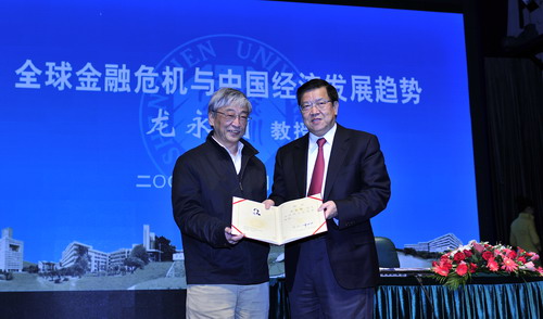12月19日,博鳌亚洲论坛秘书长、复旦大学国际关系与公共事务学院院长龙永图在国际会议厅为深大师生做了一场题为“全球金融危机与中国经济发展趋势”的精彩讲座。校领导江潭瑜、章必功、陶士平、阮双琛、李永华出席了讲座。我校还专程把龙永图就读于贵州大学期间的恩师、当时的外语系党总支书记许先华先生请到了现场。