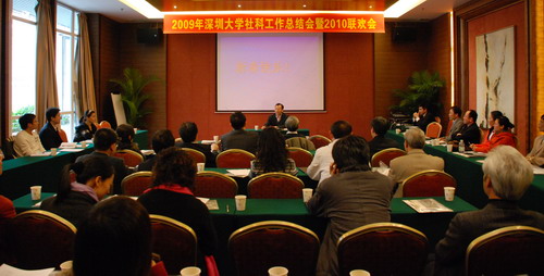 社科处姜安处长做2009年社科工作总结。总结指出,我校文科科研管理工作在以往取得成绩的基础上稳步增长,主要体现在以下四个方面:一、项目与成果管理稳步推进。2009年度国家社科基金项目立项6项,在广东高校中与华南师范大学并列第四名,立项率13.95%,明显高于全国平均立项率;并且在全国艺术科学规划项目和国家软科学项目有所突破,获得全国艺术科学规划项目2项,国家软科学项目1项;2009年项目总经费达2123万元。科研成果获省部级以上奖励11项,其中教育部1项成果获二等奖,司法部2项成果获奖。二、基地与机构建设特色鲜明,成果卓著。成立港澳基本法研究中心,设立知识产权研究所;大力发展文化产业研究,探讨文化产业发展,成功举办2009年第五届文博会vsport分会场。三、积极开展学术交流与国际合作。先后邀请蒙代尔、李昌钰等知名专家到校讲学,举办了中国数量经济年会、广东省2009年学术年会青年学者专场等多个学术会议。四、完善社科管理,增强服务意识。放眼2010年,姜安提出新一年社科工作的“十大要务”,即从加强基地建设、争取重大攻关项目立项、规划两院、策划纪念深圳经济特区成立30周年系列活动等方面,积极推进社科科研工作创新。