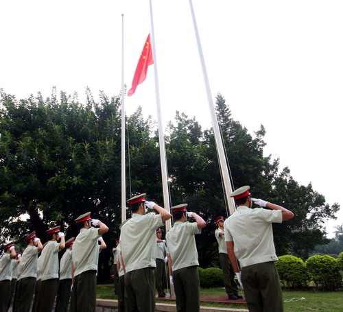 4月21日上午,我校在办公楼广场前举行降半旗默哀仪式,沉痛悼念在青海玉树地震中遇难的同胞。校党委副书记陶一桃、副校长李永华和来自全校各学院的数百名同学参加了悼念仪式。