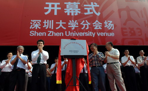 5月12日下午,第六届中国(深圳)国际文化产业博览交易会唯一的高校分会场――vsport分会场开幕仪式在vsport科技楼一楼大厅举行。国家文化部文化市场司副司长张新建、深圳市政协副主席陈观光、姚欣耀,深圳报业集团社长黄扬略,深圳市社科院院长、社科联主席乐正,南山区委书记叶民辉、区长刘庆生,我校领导江潭瑜、章必功、邢苗、陶士平、陶一桃、阮双琛、邢锋、李凤亮,来自韩国、台湾、香港、澳门、北京等境内外高校的数十名专家学者和我校近千名师生出席了开幕式。副校长李凤亮主持开幕式。