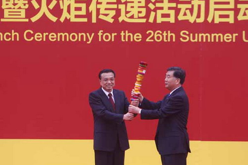 五月的北京,天清气爽,乍暖还寒。未名湖畔,垂柳依依,春波荡漾。5月4日上午,深圳第二十六届世界大学生运动会火炬传递活动在北京大学举行。中共中央政治局常委、国务院副总理李克强,中共中央政治局委员、国务委员刘延东,中共中央政治局委员、广东省委书记汪洋,教育部部长袁贵仁,广东省省长黄华华,广东省委常委、深圳市委书记王荣,深圳市委副书记、市长许勤等在北大百年讲堂出席了仪式。我校章必功校长,社会各界知名人士代表成龙、邓亚萍、白岩松、杨威、谭晶作为嘉宾火炬手与各国大学生代表一道参与了传递活动。