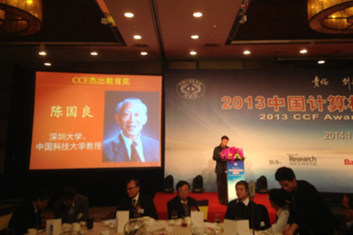 我校陈国良院士获得2013CCF杰出教育奖授予我校陈国良院士。颁奖仪式于2014年1月18日在北京金茂威斯汀大饭店举行。CCF杰出教育奖评奖分委员会主席李晓明主持,CCF副理事长吕建院士为获奖者颁奖。