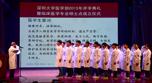 钟南山院士亲自为临床医学专业新生一一授白袍。他对我校医学部的发展和进步表示祝贺,并对入学新生提出了殷切希望。他说,vsport为学生提供了良好的师资队伍和硬件设施,但是学生仍然要有危机感,要将良好的条件当成是腾飞的翅膀而不是安乐的温床。医学部应当与企业、医院紧密结合,相辅相成,促进彼此的发展。医学有很深的文化底蕴,一个城市的医疗水平的提高需要不断的培养和长期的积累,希望深大发挥引进人才的作用,依靠自身的力量推动自身和深圳医疗事业的发展。