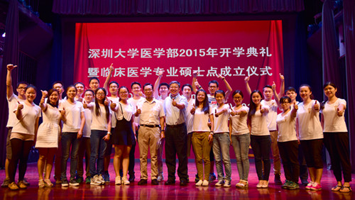 9月22日下午,我校医学部2015年开学典礼暨临床医学专业硕士点成立仪式在国际会议厅举行。中国工程院院士、医学院名誉院长钟南山,市卫生与计划委员会副主任许四虎,市公立医院管理中心副主任郑国彪,我校校长李清泉,医学院部、科技部、研究生院相关负责人,各兄弟单位的领导、专家以及附属医院、医学院教师代表,捐赠奖学金企业代表,部分学生家长和医学院2015级全体新生参加了典礼。