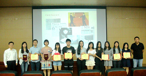 讲座结束后,我校党委宣传部部长柴金龙和武欣中为获得2015年度校园十佳记者、校园十佳新闻稿、优秀摄影作品的同学颁奖并合影留念。