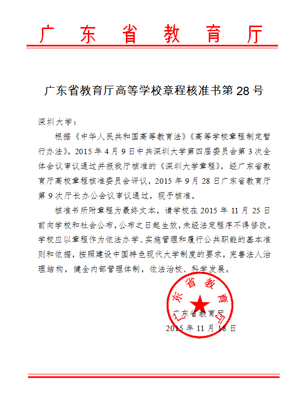 2015年11月18日,广东省教育厅发布高等学校章程核准书第28号正式核准《vsport章程》,要求向学校和社会公布,并自公布之日起生效实施。