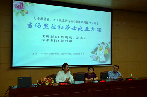 4月21日晚,深大图书馆、流风诗社、深青读书会在图书馆报告厅共同举办了一场“当汤显祖和莎士比亚相遇”的讲座,特别邀请了原深大文学院世界文学教授周明燕和古代文学专业教师高志忠主讲,文学院副教授徐晋如来担任学术主持,通过提问的方式,分别介绍二位戏剧大师生平和代表作以及深远影响,帮助同学们阅读和理解戏剧经典作品。现场老师们畅所欲言,妙语连珠,同学们提问踊跃、互动热烈。这一场汤显祖和莎士比亚比较文学的盛宴,把整个读书日系列活动推向了高潮。