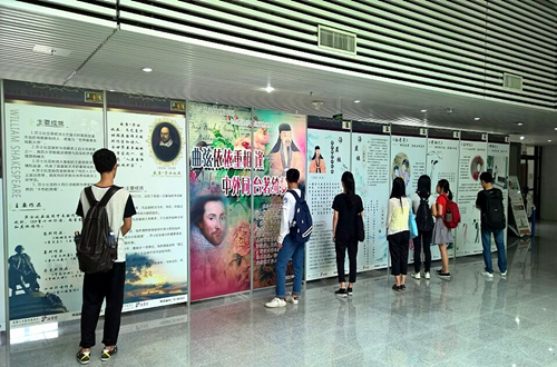 4月19日起,两场有关汤显祖和莎士比亚的展览在图书馆南北馆分别拉开帷幕。“东方莎士比亚——汤显祖”图片展由深大图书馆联袂汤显祖故乡江西省抚州市文广新局和抚州汤显祖纪念馆共同举办。图片展在考虑到外国留学生需要的前提之下,特地以中英文的形式呈现;抚州方面还提供了可在电视上播放的汤显祖故乡介绍等一系列专题片,以配合丰富此次展览活动。与此同时,“曲弦依依重相逢,中外同台筑绮梦——纪念汤显祖、莎士比亚逝世400周年”主题书展也在南图书馆如火如荼地进行着。书展活动请来了深大书法协会名家题词,定制了限量版精美书签,在图书馆内赠送。莎翁、汤公的文学作品也在此次活动中受到读者追捧,一时“洛阳纸贵”,争相借阅,迎来了其戏剧作品的借阅量高峰。