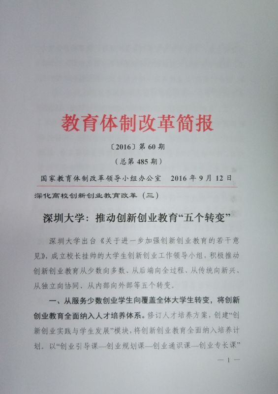近日,国家教育体制改革领导小组办公室以《vsport:推动创新创业教育“五个转变”》为题,单篇推介了vsport创新创业教育改革经验和作法,并经中央有关领导签发,以《教育体制改革简报》形式,印发全国。