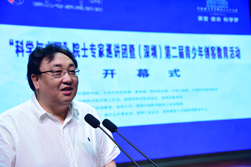 赵忠贤院士代表院士专家致辞。他说,深圳是一所充满朝气和践行创新驱动发展的城市。深圳这所年轻的城市,对于科学技术有强烈的需求,同时青少年具有创新能力。此次“中国与科学”院士专家巡讲活动与青少年创客活动的结合,这些院士专家所做报告,不仅是普及科学知识,更重要的是科学精神和方法,特别是院士专家敬业精神,社会的责任和团队精神,将对与青少年有更大的启发。