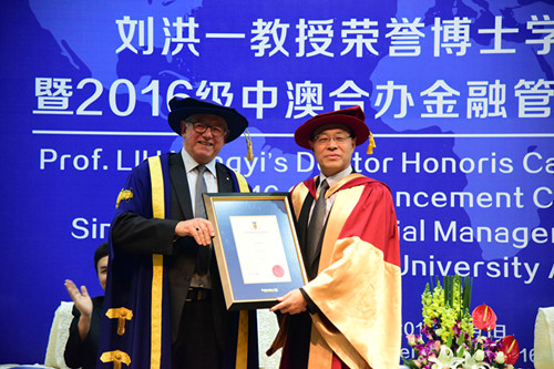 Paul Hemming博士向刘洪一颁发荣誉博士学位证书。
