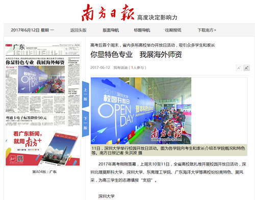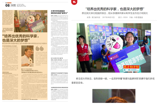 除了通过宣传片预热之外,南方都市报、深圳晚报、深圳新闻网、奥一网、学校微信公众号、微博和其他新媒体平台也进行了开放日预热,其中南方都市报于6月8日整版报道我校,并对校园开放日做了重点介绍。