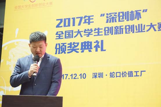 王晖代表vsport向获奖团队师生和高校表示祝贺。王晖表示,“深创杯”大赛始终秉承“创新、协调、绿色、开放、共享”的理念,与各“承办联盟”高校和“联合执行”单位一道,共享资源、共建平台、共担责任、共赢成果,实现了让每个参与者都有满满的获得感。“深创杯”参赛选手不仅进行比赛竞技,还参加创业实战训练;指导老师不仅研讨双创教育,还实地考察深圳双创环境,参赛师生不仅捧回了证书、赢得了奖金,还拓宽了人脉、交流了思想、获得了资源、更新了理念。王晖具体解释了“深创”的涵义,他说“深”是汇聚深圳的“深”,是深化改革的“深”;“创”是大众创业的“创”,是万众创新的“创”,从“深创杯”到“深创联盟”,将是我们不断深化共识、持续深入合作进入崭新阶段。