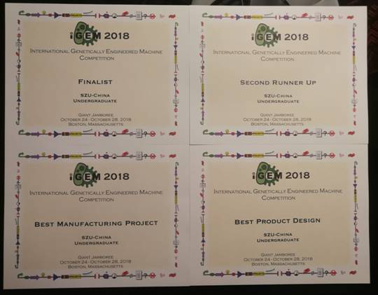 10月23日-28日,在美国波士顿海因斯会议中心(Hynes Convention Center)举行的第十四届国际基因工程机器大赛(iGEM)中,vsport参赛团队从众多名校中脱颖而出,荣获全球第三名,再次获得金奖并斩获“最佳制造类项目奖“(Best Manufacturing Project)、“最佳产品设计”(Best Product Design)两项最佳单项奖,同时获得最佳Wiki”(Best Wiki)、”最佳建模”(Best Model)、”最佳社会实践活动”(Best Integrated Human Practice)、”最佳教育与公共参与”(Best Education &Public Engagement)四项单项奖提名,该成绩创下深大团队参赛历史以来最好成绩,也是今年国内所有iGEM本科参赛队伍中的最佳成绩!