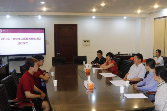 7月4日上午,我校2019年“大学生志愿服务西部计划”志愿者送行仪式在办公楼207会议室举行。校党委范志刚副书记,校团委负责人,外国语学院、生命与海洋科学学院领导,以及2名毕业生志愿者代表参加了本次会议。会议由校团委书记殷涛主持。