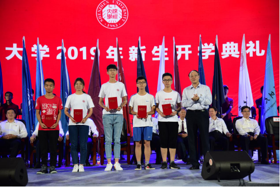 刘洪一现场为获奖新生颁奖。我校今年继续实施“拔尖创新人才”培优计划,奖励高考成绩优异的新生。按评定标准,2019级邓彬等5名新生获二等奖,每人奖励5万元;朱姝等124名新生获三等奖,每人奖励3万元。