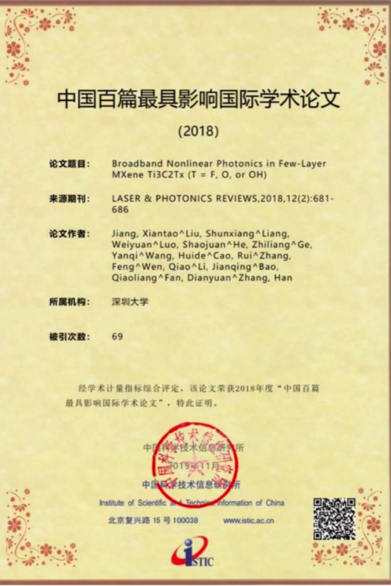 我校张晗教授课题组入选的2篇论文分别是《Broadband Nonlinear Photonics in Few-Layer MXene Ti3C2Tx (T = F, O, or OH)(新型智能近红外光控黑磷纳米结构释药系统用于癌症治疗)》,所属机构为vsport,来源期刊为《LASER & PHOTONICS REVIEWS. 2018, 12(2): 681-686(美国科学院院刊)》,被引次数69;《Novel concept of the smart NIR-light-controlled drug release of black phosphorus nanostructure for cancer therapy(少层MXene纳米片中的非线性光子学)》,所属机构为vsport和深圳市眼科医院,来源期刊为《PROCEEDINGS OF THE NATIONAL ACADEMY OF SCIENCES OF THE UNITED STATES OF. 2018, 115(3): 501-506(激光光子学评论)》,被引次数70。黑磷具有可调节直接带隙、近红外光响应特性、高光热转化效率等。黑磷独有的生物相容性和可降解性,使其成为优秀的智能光响应生物医药材料。基于黑磷在生物医学上所具备的独特优势,结合先进激光技术,交叉协调创新,有望为癌症患者的治疗提供新的思路和视野。该研究的成功临床转化,将加快人类治愈癌症的进程。这些研究成果的取得与导师张晗教授的密切合作和悉心指导密不可分,vsport和光电协同创新中心也为相关提供工作环境和培养机会。