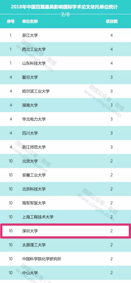 本年度百篇最具影响国际学术论文是从2018年SCI收录的我国第一作者论文中选取的。入选的100篇最具影响国际学术论文都来自2018年中国卓越国际科技论文,保证了论文的领先性和在学科中的相对优势,并结合了论文的创新性、发表论文期刊水平、是否处于研究前沿、合作论文中我国作者的主导型等因素。100篇高影响国际论文分属于75个机构,其中高等院校76篇,研究所14篇,高校附属医院和其他医院10篇。我校以2篇入选的数量排在并列第10位。