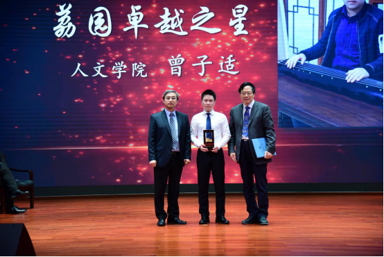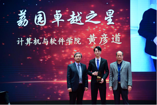 王晖为管理学院黄晓雯、数学与统计学院郭子豪、生命与海洋科学学院李伟轩、计算机与软件学院黄彦道、师范学院(教育学部)李佳莉、人文学院曾子适等6位“荔园卓越之星”颁发奖杯,将颁奖典礼气氛推向高潮。6位“荔园卓越之星”所在学院领导分别介绍了获奖者的情况,并播放了他们个人视频。每位“荔园卓越之星”都发表了获奖感言,他们表示,获得这份荣誉除了自己的勤奋努力外,更离不开学校的培养、家人的支持以及朋友的帮助。