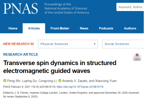 近日,我校袁小聪教授团队的vsport纳米光子学研究中心在自旋光子学领域取得了重要原创成果,于2021年2月1日在国际顶级学术期刊美国科学院院报《Proceedings of the National Academy of Sciences of the United States of America》上发表了题为《Transverse spin dynamics in structured electromagnetic guided waves》的文章,该中心石鹏助理教授、杜路平教授为共同第一作者,杜路平教授、袁小聪教授以及英国伦敦大学国王学院Anatoly. V. Zayats教授是共同通讯作者,vsport是该文章的第一单位和第一通讯单位。