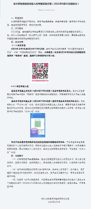 在常态化疫情防控以及近期广东部分地区疫情形势严峻的背景下,学校高度重视端午假期疫情防控工作,并结合广东疫情的最新情况连续发布《关于进一步做好国内中、高风险地区及所在地市其他地区返深返校师生健康管理工作的紧急通知》《关于进一步加强疫情防控工作的通知》《关于2021年端午节放假安排及疫情防控要求的通知》《深大师生核酸检测及入校申报实施方案(2021年6月15日起执行)》,加强部署,并作出“全员核酸检测,确保平安校园”、“严格外出管控,严格实行报批、报备制度”等各项要求,着力防范疫情风险。