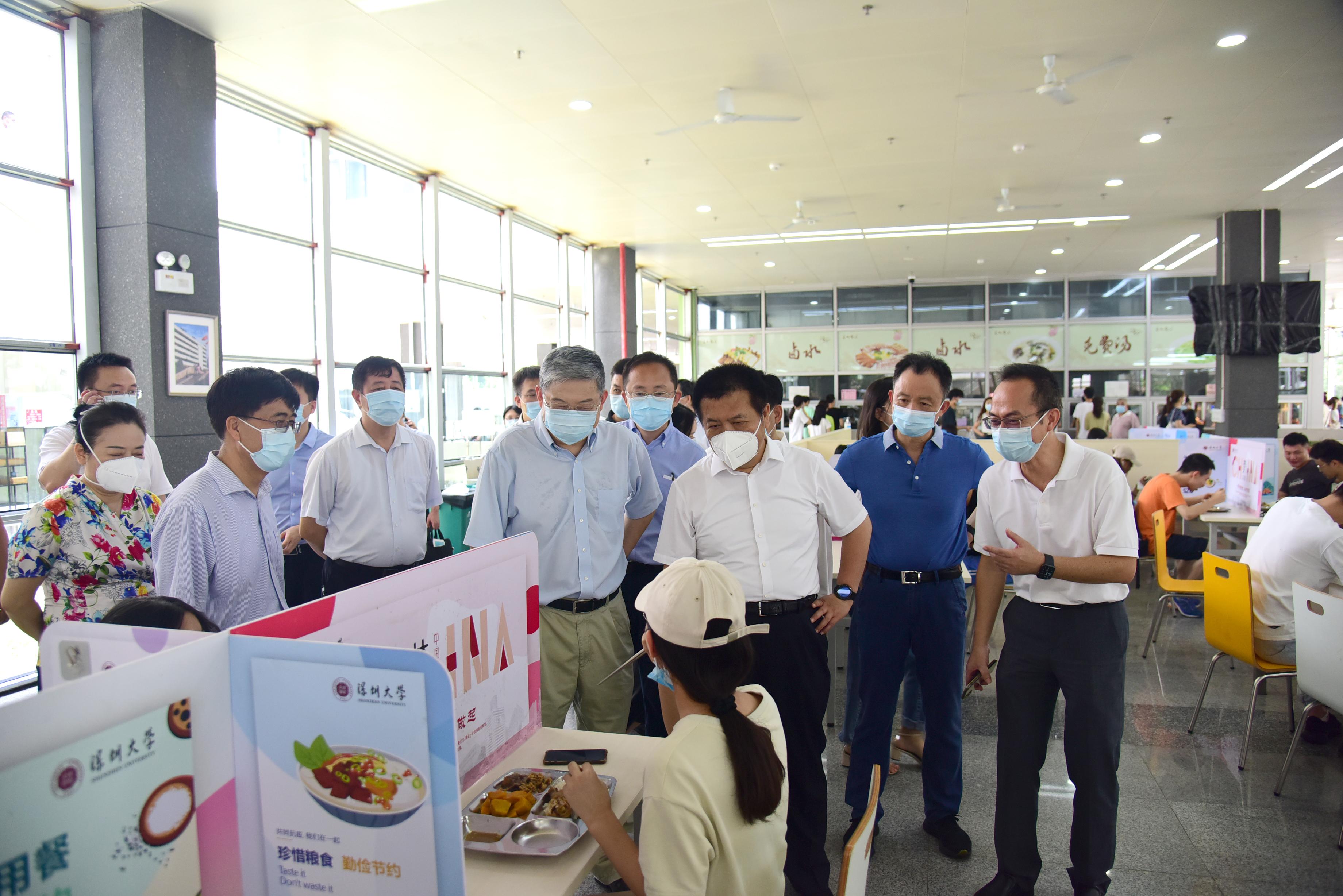 听取汇报后,工作组来到我校学生生活区,检查食堂和宿舍等区域的疫情防控工作。疫情期间,学生进入宿舍需要检测体温。同时,食堂配置自动体温检测设备,桌上设置挡板,学生佩戴口罩进入食堂,排队时需要保持一定的距离。雷海潮随机向学生了解询问食堂就餐、防疫措施等情况。随后,雷海潮来到粤海校区书院活动室,通过查看学生健康码了解疫苗注射以及核酸检测情况,与学生亲切交流。“你最近一回家是什么时候?”“打过疫苗吗?”“是校内注射疫苗还是校外注射?”“最近一次核酸检测是什么时候?”学生一一回答。