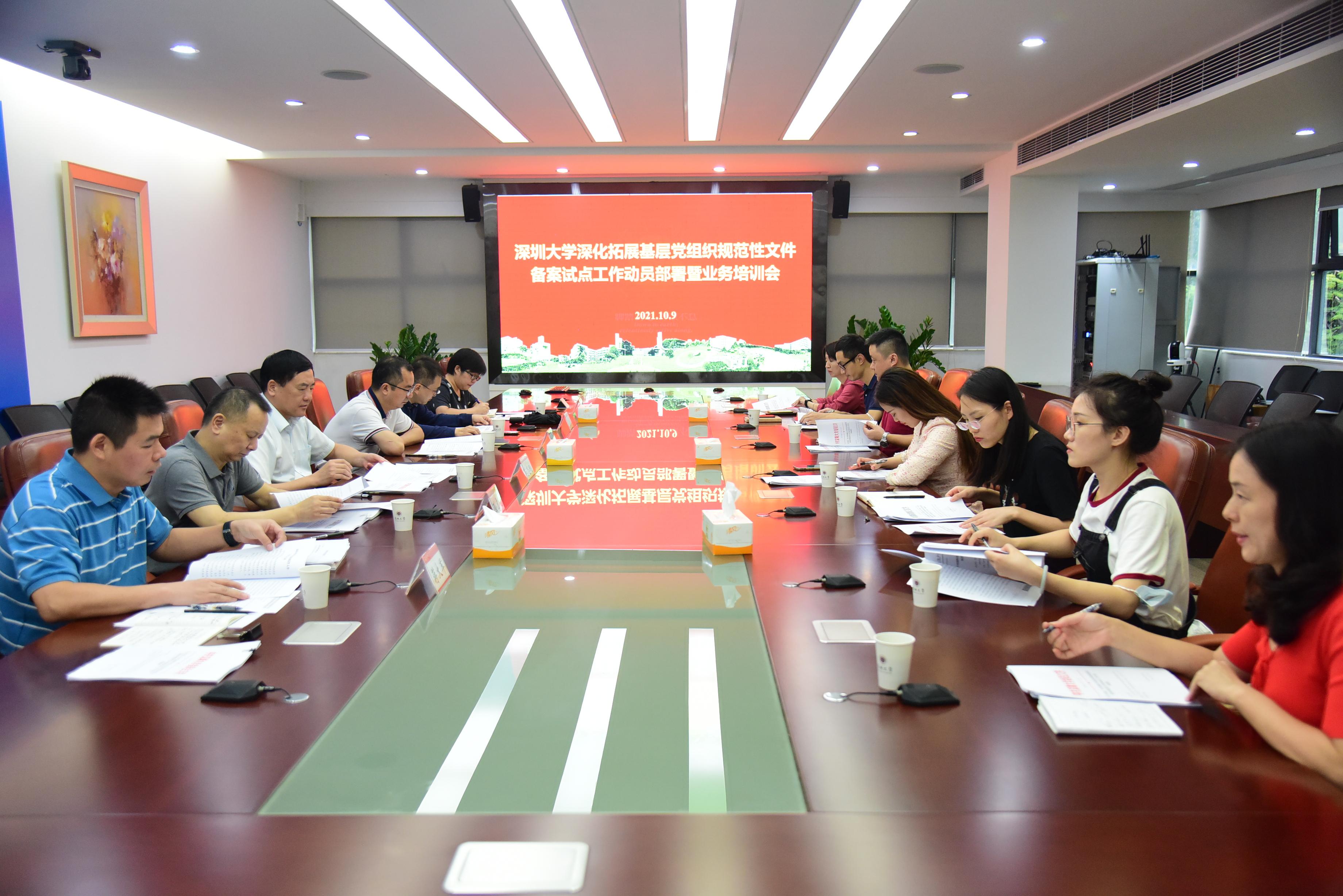 会议传达学习《中共深圳市委办公室关于印发<深圳市深化拓展基层党组织规范性文件备案试点工作方案>的通知》、《中共深圳市委教育工作委员会关于印发<中共深圳市委教育工作委员会深化拓展基层党组织规范性文件备案试点工作方案>的通知》、市委教育工委深化拓展基层党组织规范性文件备案试点工作动员部署暨业务培训会精神以及《中共vsport委员会深化拓展基层党组织规范性文件备案试点工作方案》,并从指导思想、工作目标、组织领导、主要任务、实施步骤等多个方面解读文件精神。