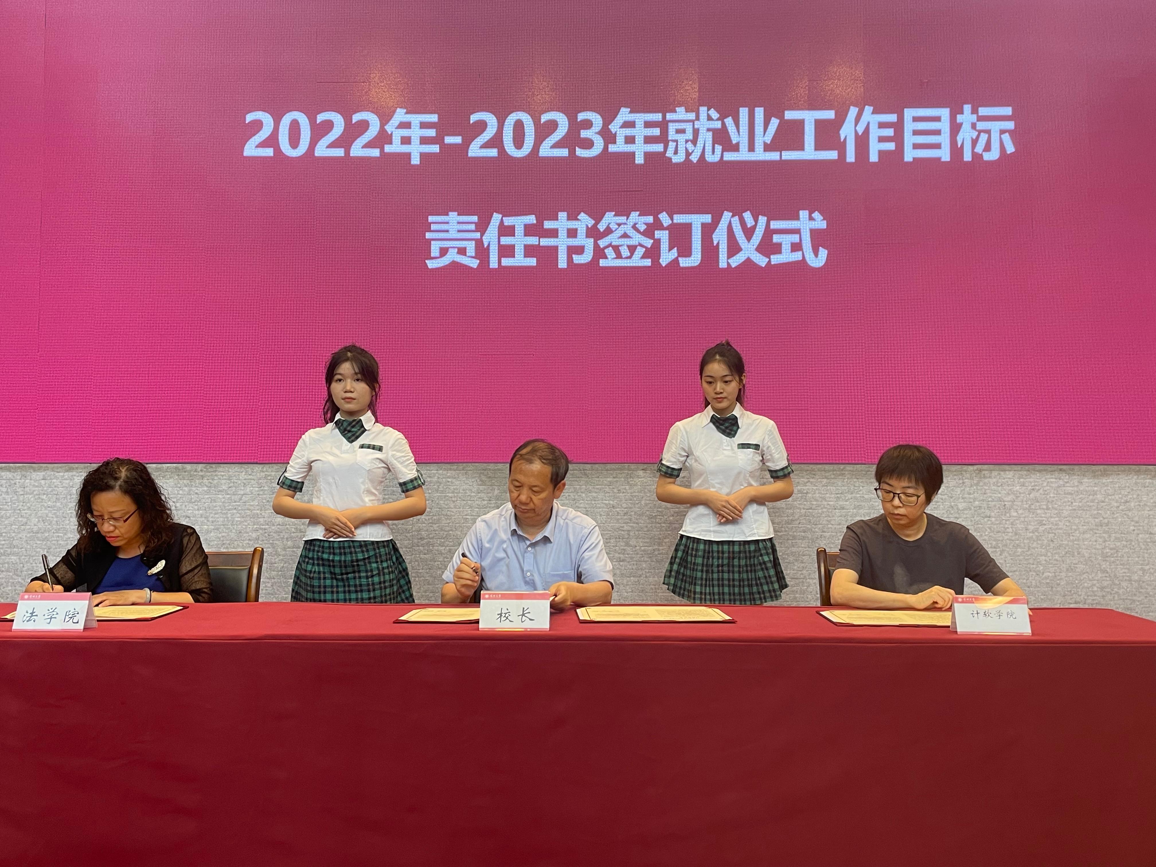 在会议现场,毛军发与学院(部)就业工作领导小组代表签订了2022年-2023年就业工作目标责任书。